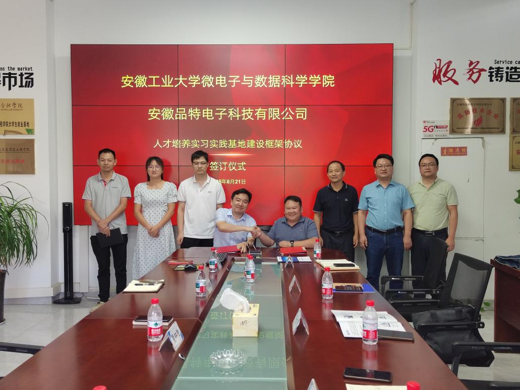 在安徽品特电子科技有限公司,企业负责人夏林胜总经理介绍了企业的业务范围、工艺流程和设备等。杨二光介绍了公司的人才培养和团队建设等情况,汪春胜期待双方能在人才培养、实习实训、就业和项目合作等方面密切合作,实现高质量的产教融合。双方签订了校企实习实训基地框架协议。