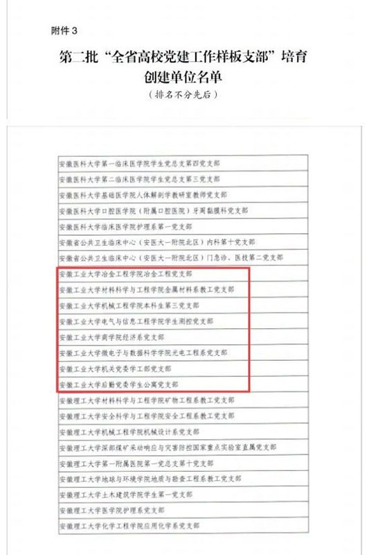 自教育部和安徽省实施新时代高公司党建示范创建和质量创优工作以来,公司先后入选“全国党建工作样板支部”1个,省级“样板支部”2个。